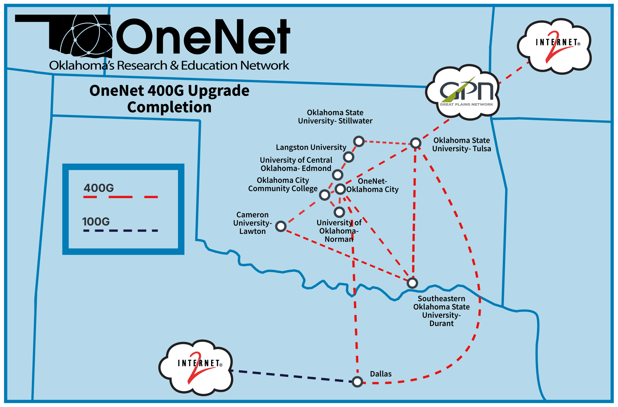 “Our new 400G backbone extends to Woodward in the northwest part of the state, to Durant in the southeast, and many other communities across the Oklahoma Community Anchor Network,” Graham said. “This upgrade helps us meet the ever-increasing bandwidth needs of rural schools and libraries driven by the increased use of technology and internet-based learning resources.”