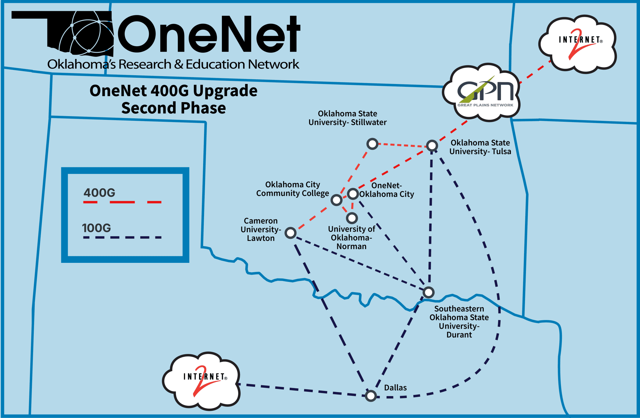 OneNet’s engineering team has completed the second phase of our 400G network upgrade. This phase connects Oklahoma’s largest research universities—Oklahoma State University and University of Oklahoma to OneNet’s new 400G network backbone.